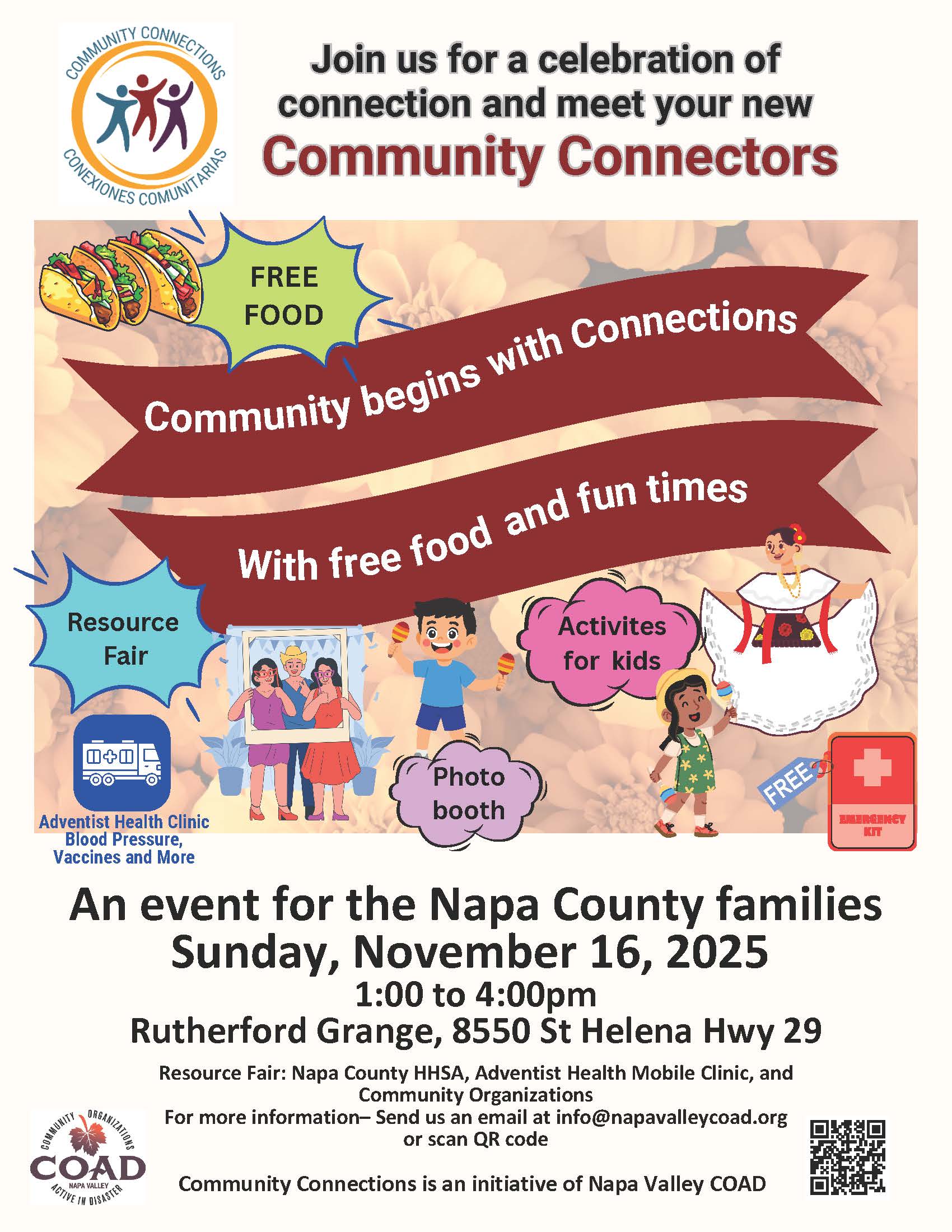 - Napa Valley COAD Community Connections Launch Event - SUNDAY, November 16 - 1:00 to 4PM at the Rutherford Grange October 15, 2025